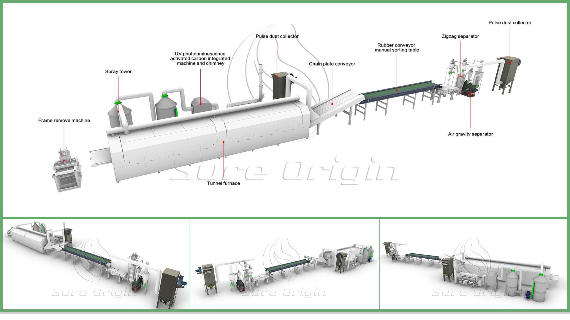 The Solar PV Panel Recycling Machine works together with the Frame Removal Machine, Glass Removal Machine, and Solar PV Panel Dismantling Machine to efficiently separate aluminum frames, glass, copper, silicon powder, silver, and plastic from photovoltaic modules, while the pyrolysis furnace and tunnel furnace further support clean and effective material processing.