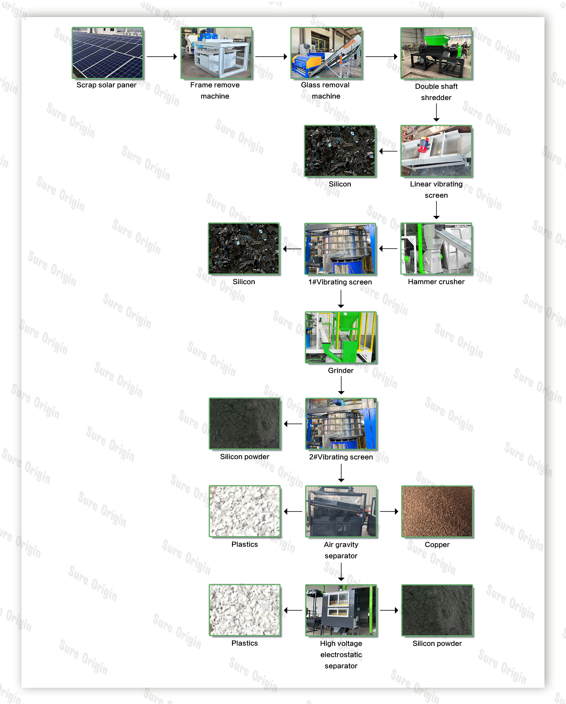 After physical crushing and separation, waste solar panels can be processed to recover glass particles, aluminum frames, silicon powder, copper, and small amounts of silver, as well as plastic materials such as backsheet and EVA. Through a well-designed separation process, multiple materials can be efficiently recycled, improving overall resource utilization and recovery value.