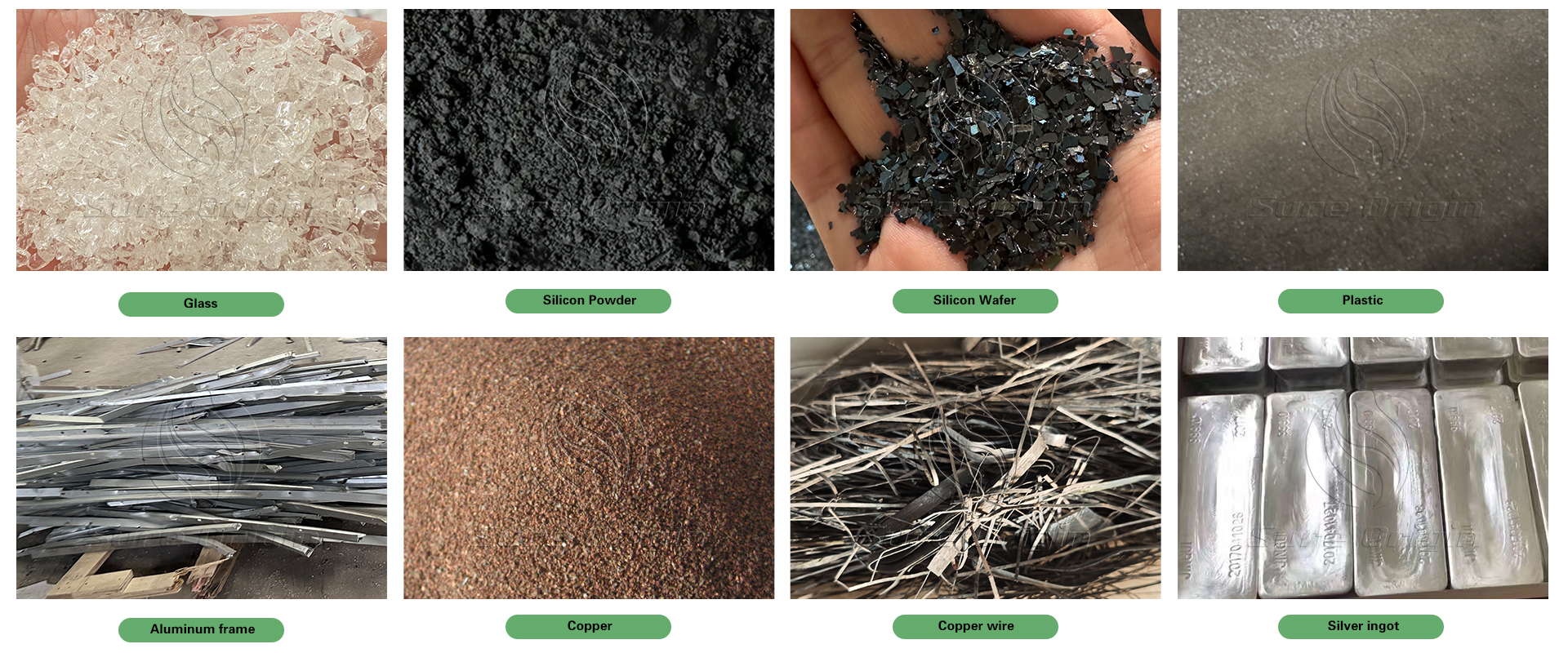 After physical crushing and separation, waste solar panels can be processed to recover glass particles, aluminum frames, silicon powder, copper, and small amounts of silver, as well as plastic materials such as backsheet and EVA. Through a well-designed separation process, multiple materials can be efficiently recycled, improving overall resource utilization and recovery value.